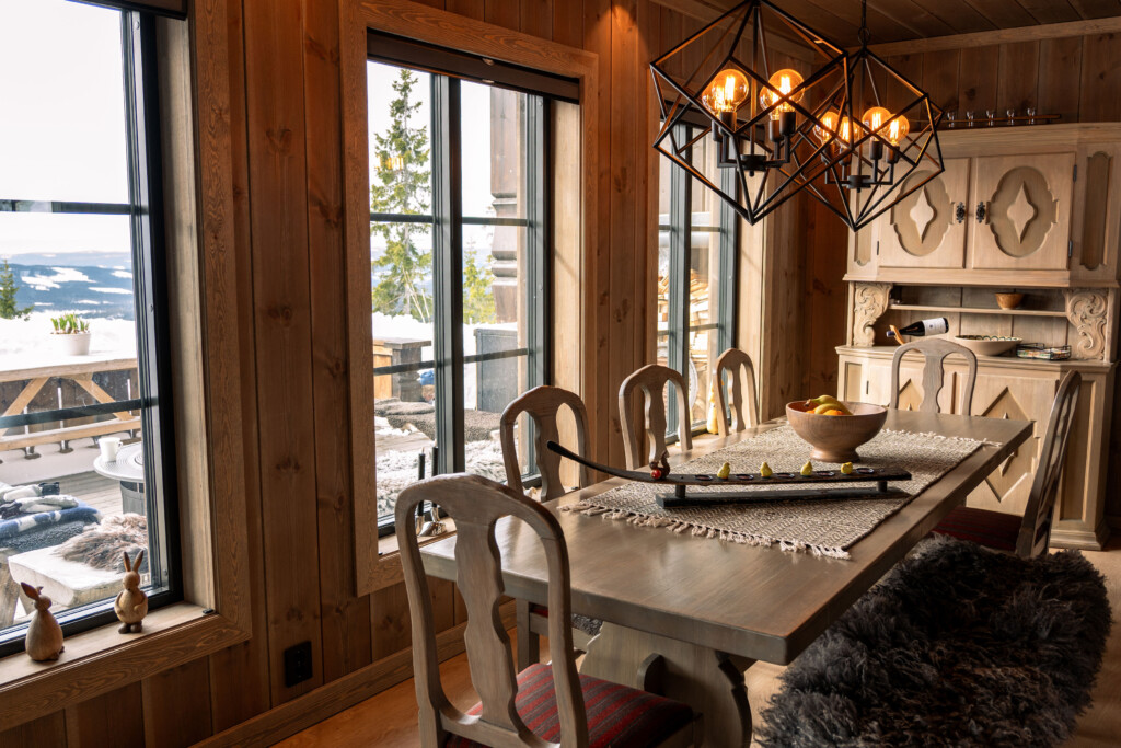 Balansen mellom natur og lunhet: Store vinduer for utsikt, men materialvalg som gjør at hytta føles trygg og lun.